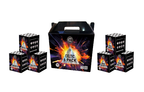 A carry pack of six assorted cakes, each with 16 shots and featuring a variety of colors and effects.