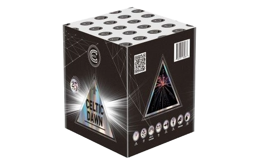 A 25-shot cake featuring purple tails that bloom into purple peony bursts, green tails transforming into green peonies, each burst beautifully enhanced with a golden strobe.