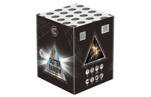 A 30-shot cake featuring green glitter with red dahlia stars and orange glitter with purple stars.