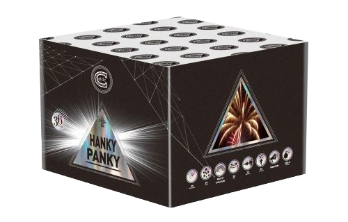 A 36-shot cake featuring golden tails that burst into gold willows with purple stars, followed by gold willows with silver crackling stars.