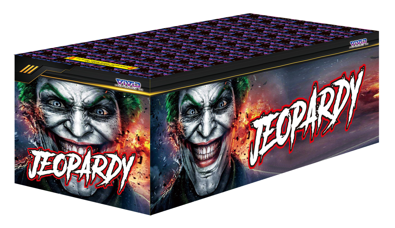 Jeopardy delivers 64 dazzling shots of red, green, and blue star tails that soar into brocade crown bursts tipped with matching colors. Pulses of red tails to brocade to red blink, green tails to brocade to green blink, and blue tails to brocade to blue, with matching colored mines below, lead into a Z-firing W fan of stunning gold glittering crowns. A volley of red, blue, and gold mines shoots upward into matching bursts above, hanging beautifully in the sky. Truly spectacular!