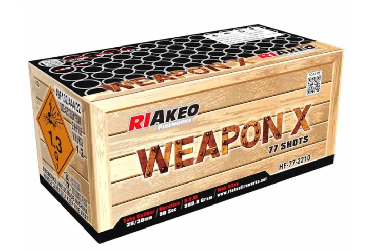 The Weapon X compound from Riakeo Fireworks is a must-have for any celebration, delivering 77 spectacular shots bursting with vibrant colors and stunning effects. Its pulse-firing action creates incredible displays that light up the sky.